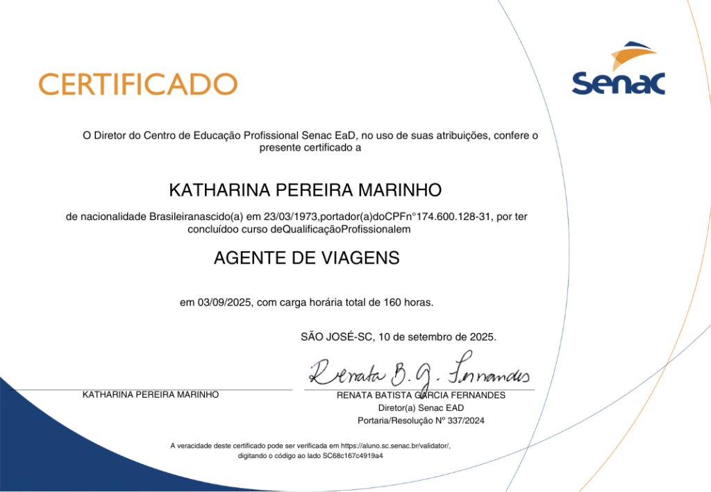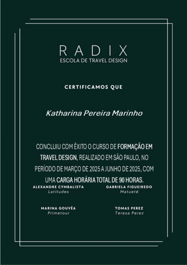 Fui estudar, me aprimorar, aprender as técnicas, fazer tudo do jeito certo… Especializei-me como Travel Designer, com foco em roteiros sob medida para viajantes que buscam cultura, conforto, autenticidade e memórias inesquecíveis.